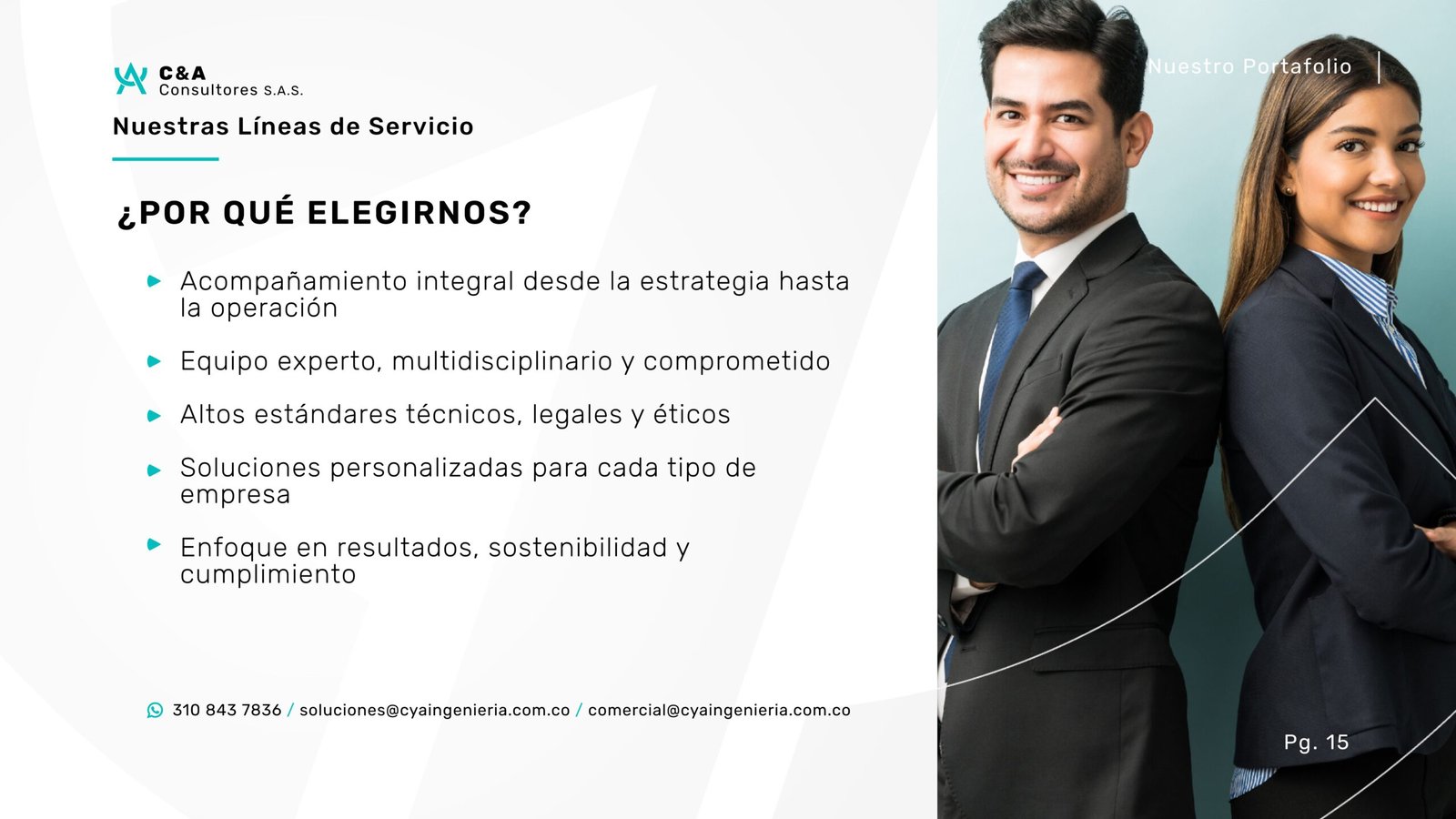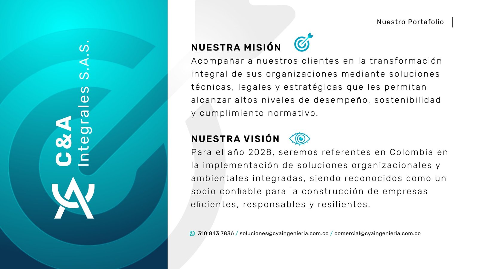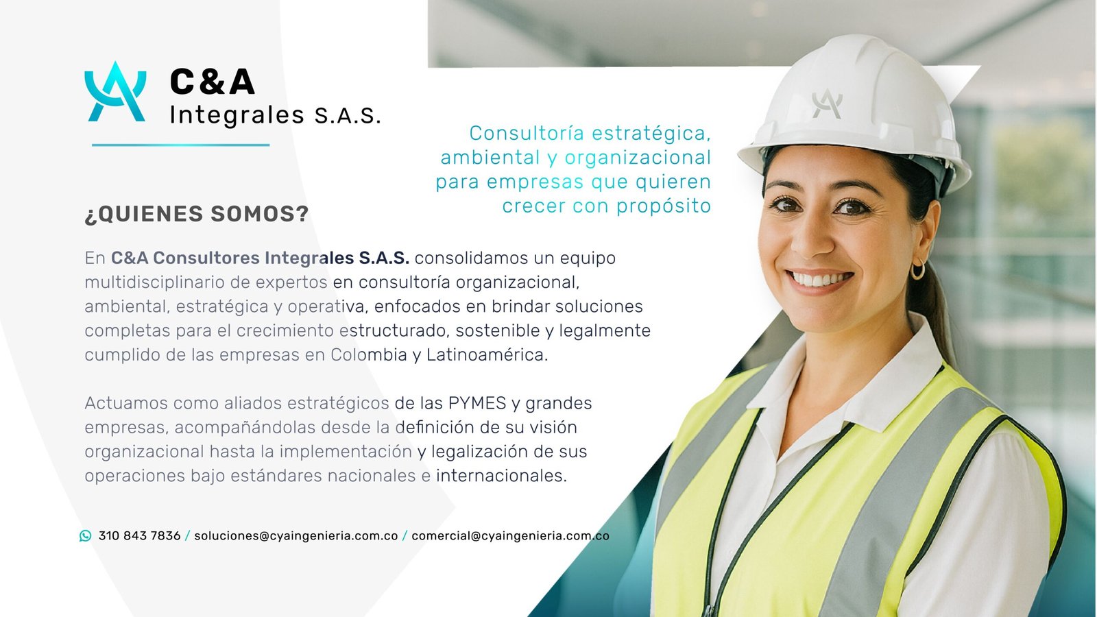 En C&A Consultores Integrales S.A.S. consolidamos un equipo multidisciplinario de expertos en consultoría organizacional, ambiental, estratégica y operativa, enfocados en brindar soluciones completas para el crecimiento estructurado, sostenible y legalmente cumplido de las empresas en Colombia y Latinoamérica.